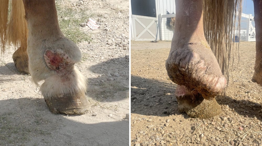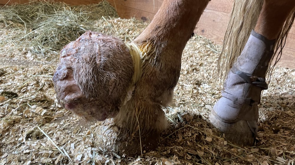 Dr. Metcalf warned us that this process would get ugly, really quickly, as the tissue starts to dissolve and die. He wasn't kidding. We won't show photos here -- but over 7 days, the sarcoid looked like it was melting away. The team had to keep spraying fly spray on it. But every day, it would look more and more like the Wicked Witch who melted into the ground. Until day 7 when they found the remainder of it laying in a field.