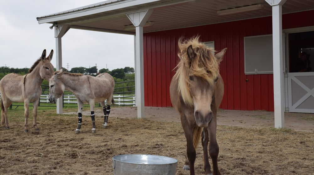 Who knew a whole company could be so excited about rocks! It's taken 5 long months to build an incredibly important system in our pasture: A 200-foot pebbled drainage system around our barns, which will directly equate to longer lives for our rescues! How does a drainage system make such a difference? Checkout the earlier photos from the ranch (below). When it rained, the paddock around the barns turned to quicksand. Thousands of gallons of water starting high up on our hills, comes flooding down in rains. For years, it was just challenging: dragging 50-pound muck buckets through 6 inches of mud required muscle and endurance! Admittedly, several crying episodes when it was just too much for 1 person, and it's all but you can do, to sit in a stall and collect yourself before giving up entirely. But eventually, this situation became dangerous for the animals. Rescuing tough farm cases so often involves the feet. Former owners become negligent in their care --
