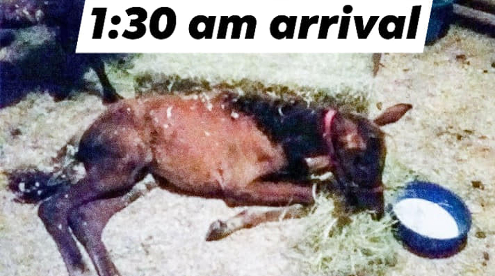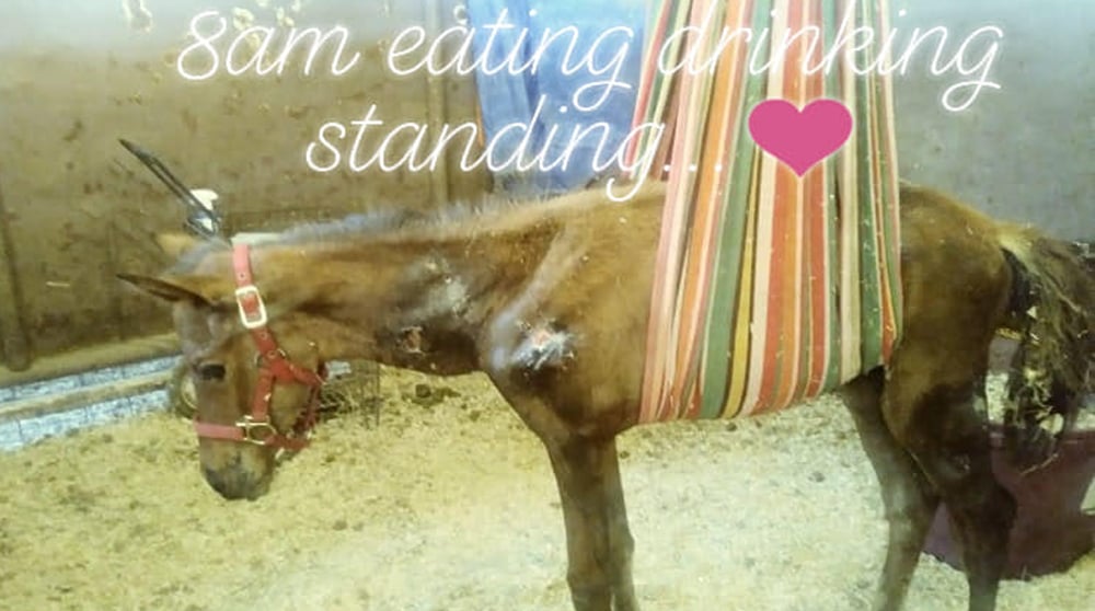FarmHouse Fresh pulled proceeds from your 2019 purchases and donated to this foal’s recovery fund—along with 11 other generous, kindhearted people. By 1:30 a.m. Trouper was at Miss Jo's, having his wounds tended, receiving IV fluids and antibiotics. By morning, Trouper was showing that even though the odds were stacked against him, he had fight left. He ate a little, drank a little, and with help, was standing.